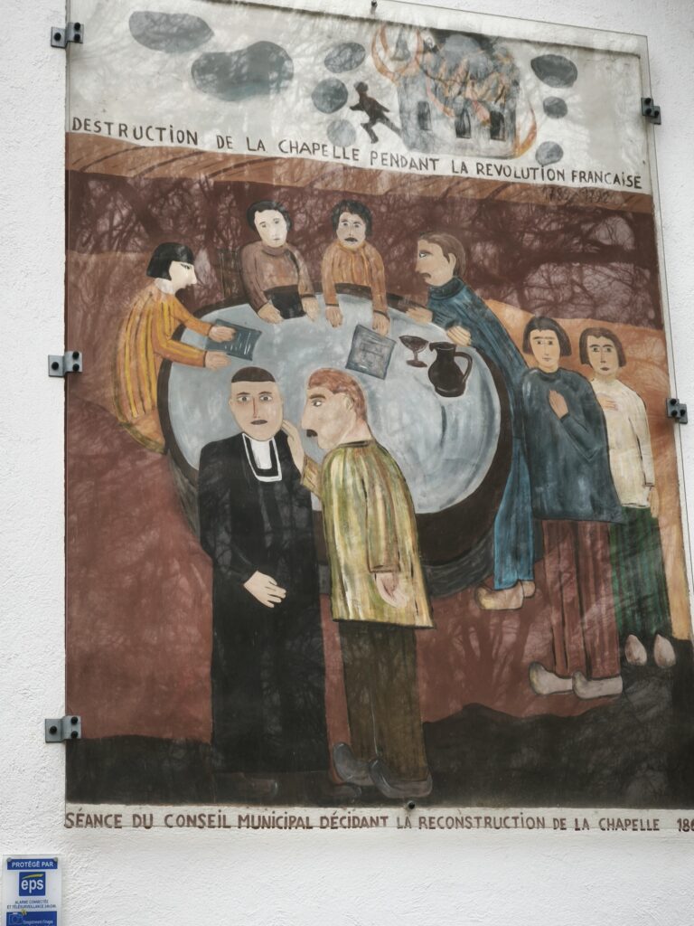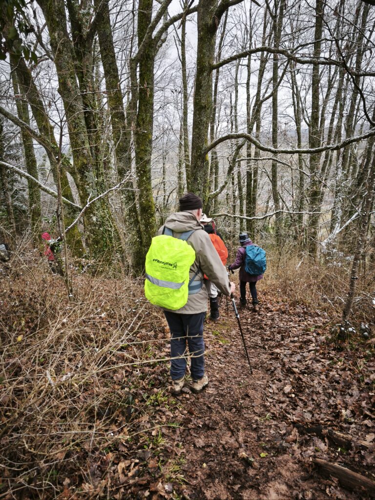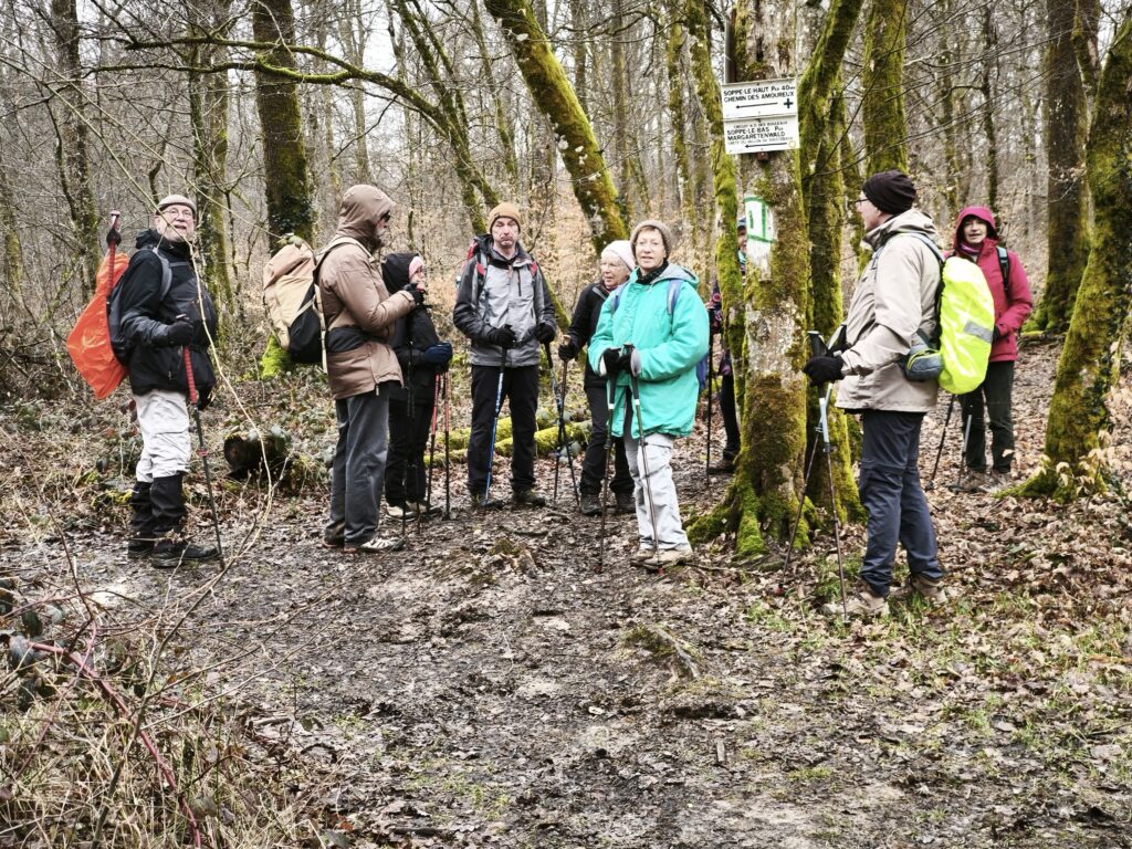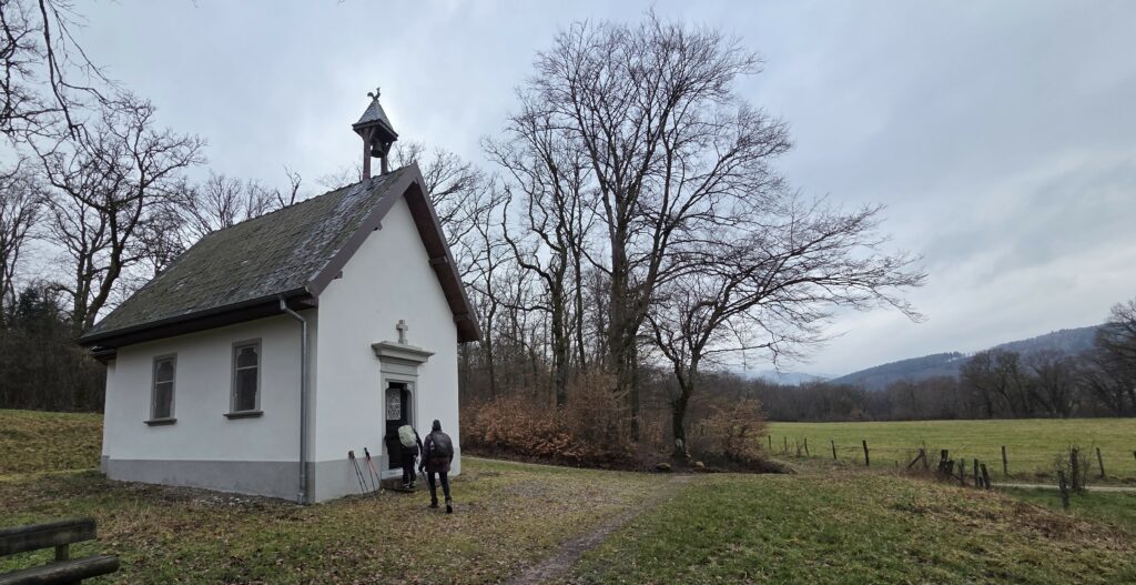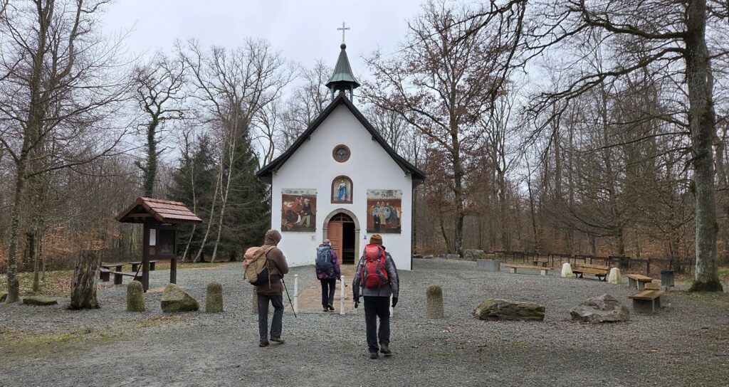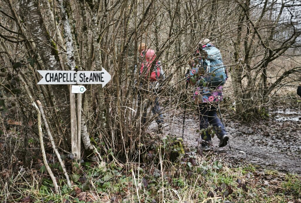 Nous y rejoignons un bout du chemin de Compostelle qui nous mène jusqu’à la chapelle Notre-Dame des Bouleaux (toujours ouverte) où la pause de midi est réchauffée par une bonne bouteille de Danielle et le partage de gourmandises sucrées.
