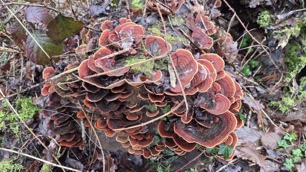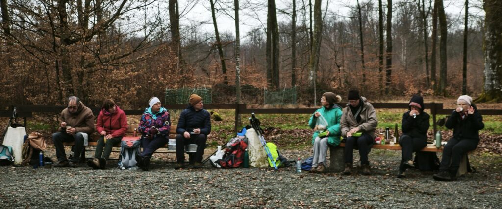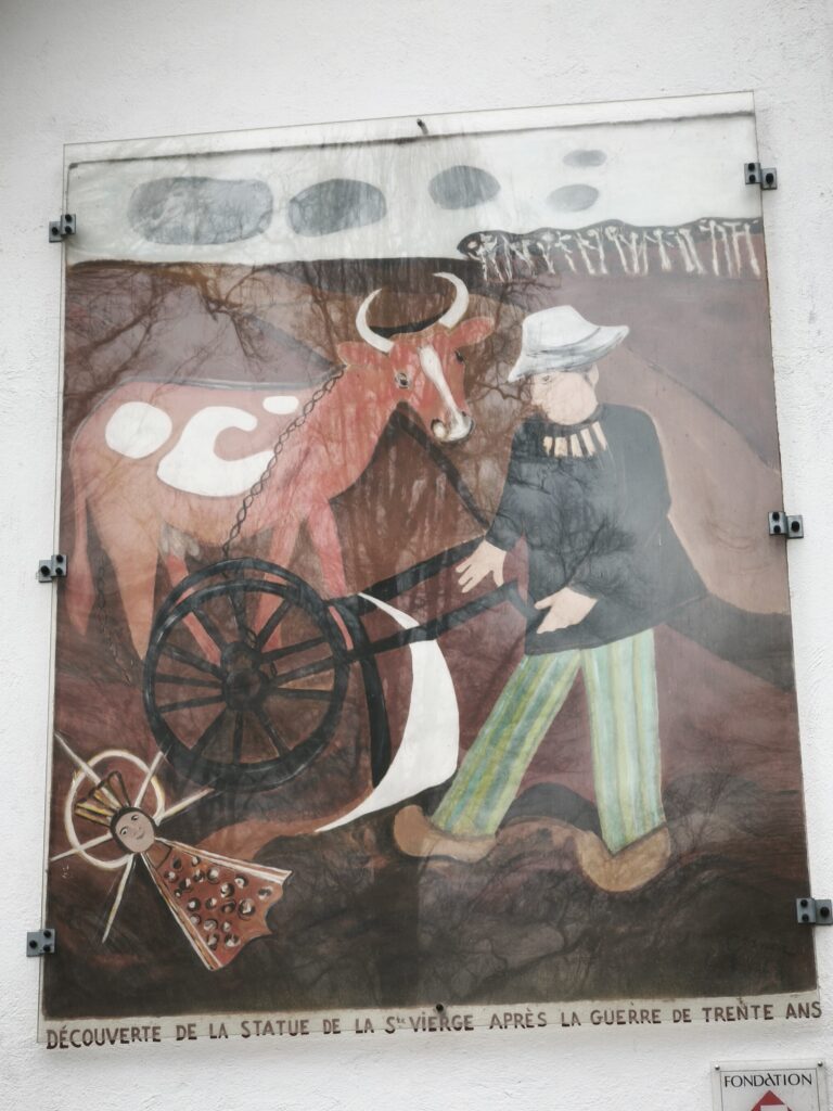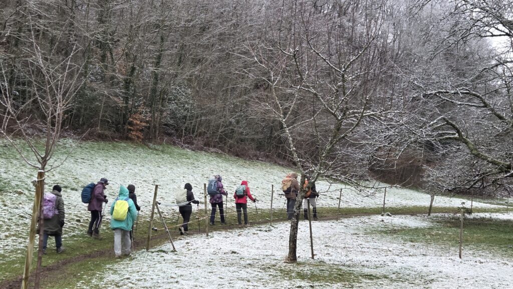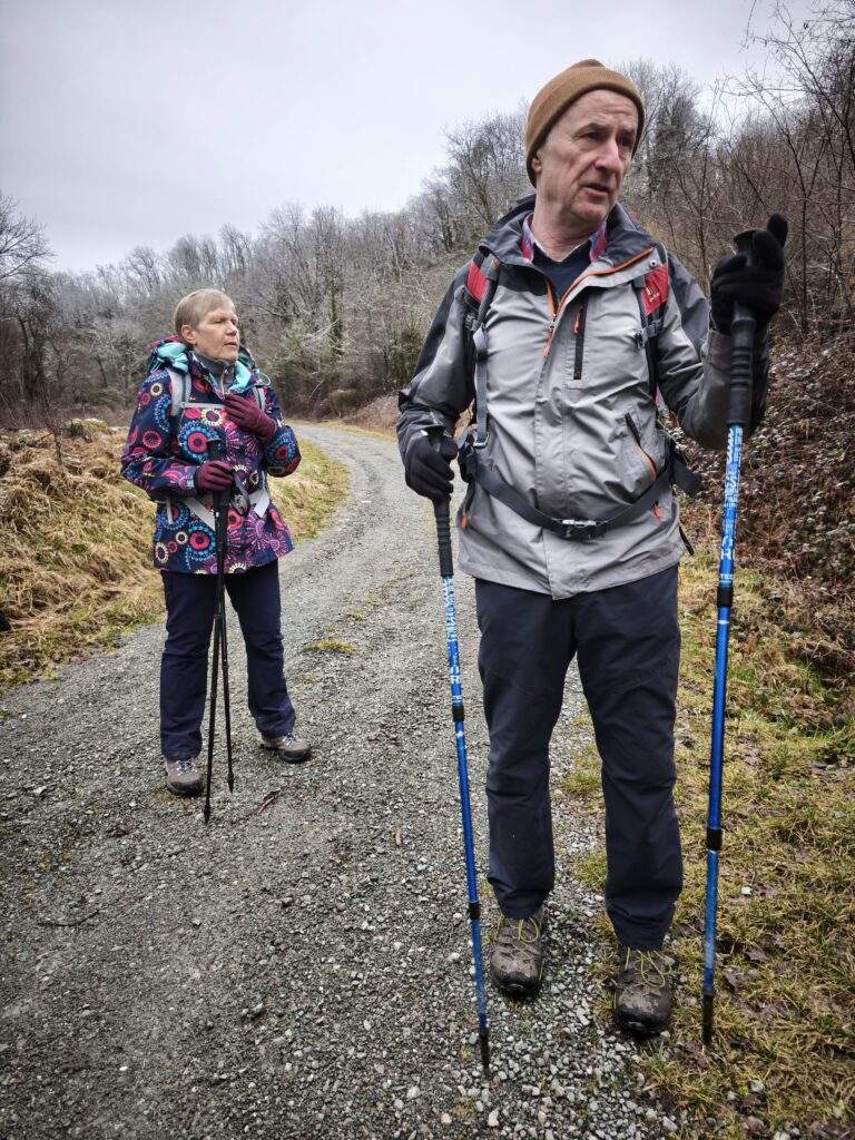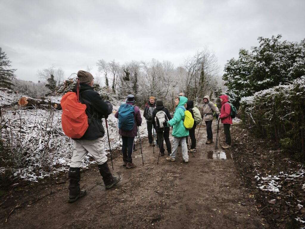 Nous y rejoignons un bout du chemin de Compostelle qui nous mène jusqu’à la chapelle Notre-Dame des Bouleaux (toujours ouverte) où la pause de midi est réchauffée par une bonne bouteille de Danielle et le partage de gourmandises sucrées.
