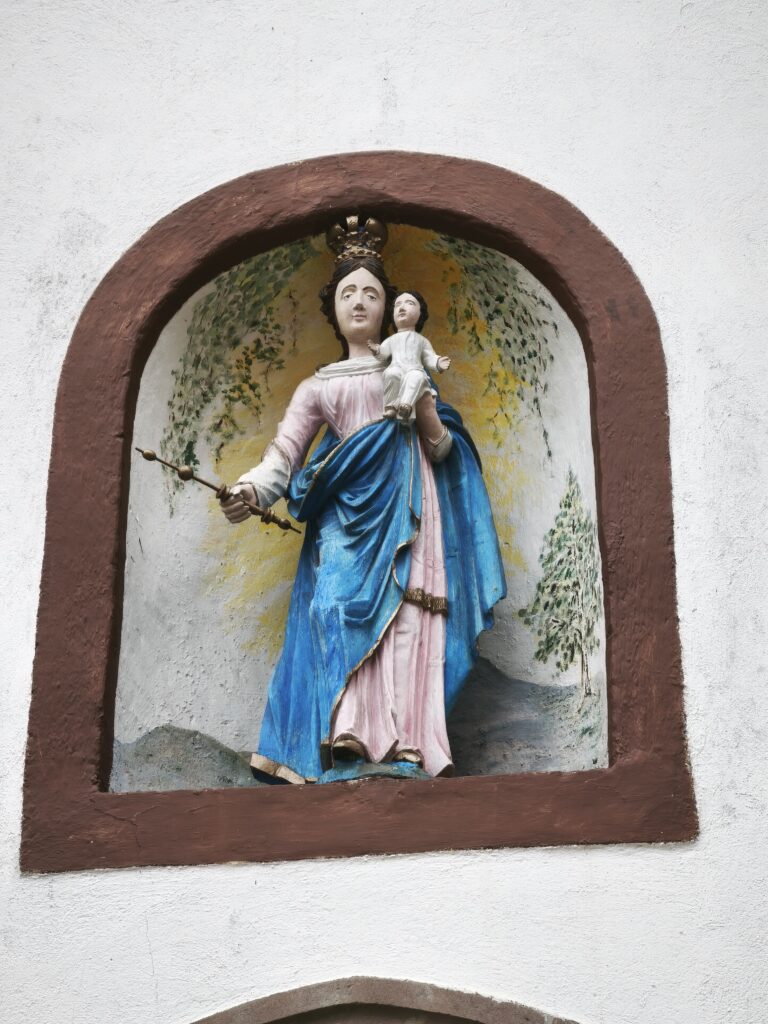 Arrêt au sommet à côté de la statue de la Vierge avec vue sur Sentheim et sa maison de convalescence.