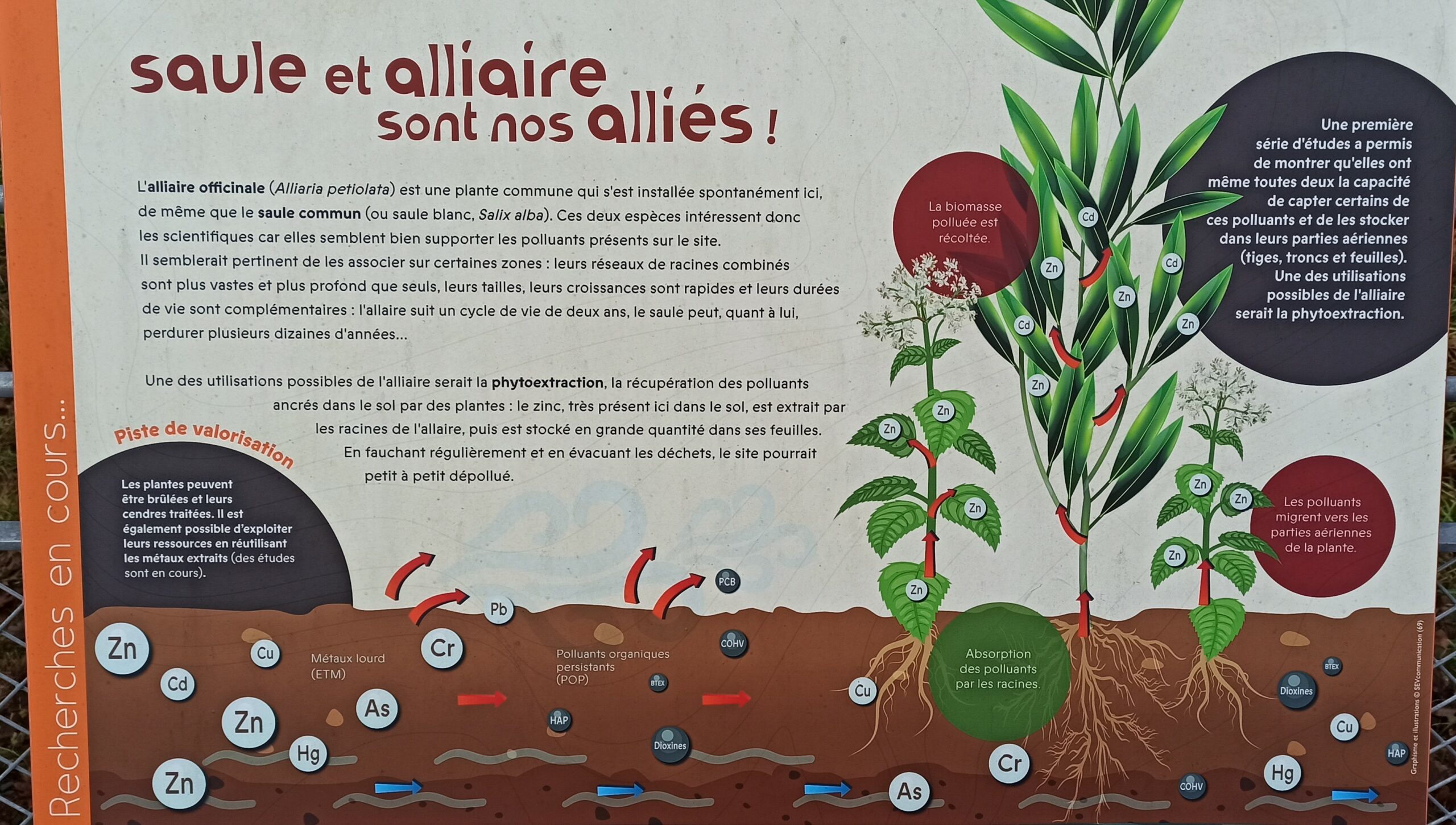 Nous continuons vers  le parc des alliaires où des panneaux expliquent comment l’homme modifie la constitution des sols et les solutions naturelles pour les dépolluer.