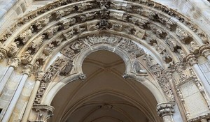 Notez sous le porche, une femme et un homme tenant la maquette d'une église. Les fondateurs ?