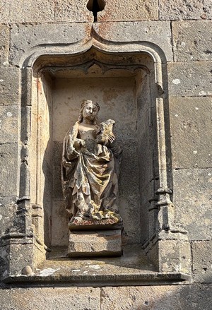 - La Porte du Bourg était équipée d’un pont-levis dont on peut voir les rainures dans la façade. À son sommet une rangée de mâchicoulis protégeait l’accès. Contre la façade on remarque une niche avec une statue mutilée de la Vierge à l’Enfant.