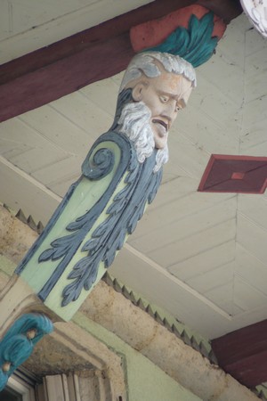 Côté rue, on peut voir au linteau d'une fenêtre du premier étage les armoiries de la ville et la date de construction. Les cinq cariatides de la façade sont exceptionnelles. Elles constituent avant tout des poutres destinées à soutenir la partie supérieure du pignon mais elles présentent également un caractère symbolique. Le personnage central portant le glaive et la balance est l'image de la justice. L'interprétation des autres figures est plus délicate: elles pourraient représenter la civilisation face au monde sauvage et donc les cinq éléments sculptés symboliseraient la justice s'étendant à l'ensemble de l'humanité.