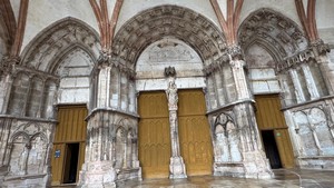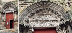 Un porche à triple portail permet l’accès à l’intérieur de la collégiale, tandis qu’une large porte appelée « Porte des Bleds » ouvre sur un côté de l’édifice. Elle est surmontée par un riche tympan finement sculpté relatant l’incrédulité de Saint Thomas et l’évangélisation des Indes.