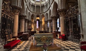 À l’intérieur, une étroite et haute nef conduit au chœur que surmonte un triforium décoré de nombreuses têtes sculptées.