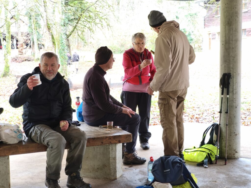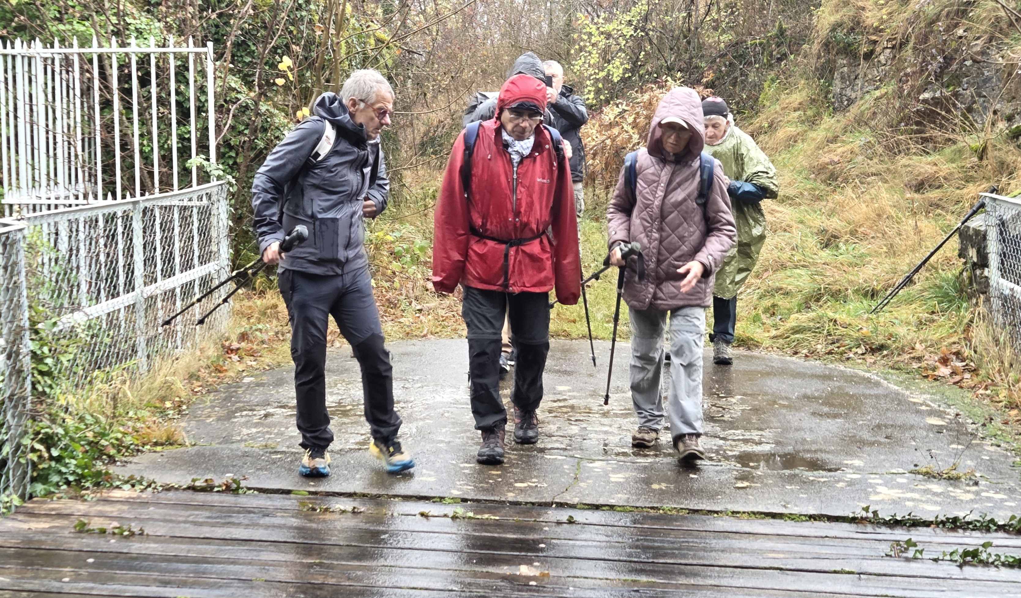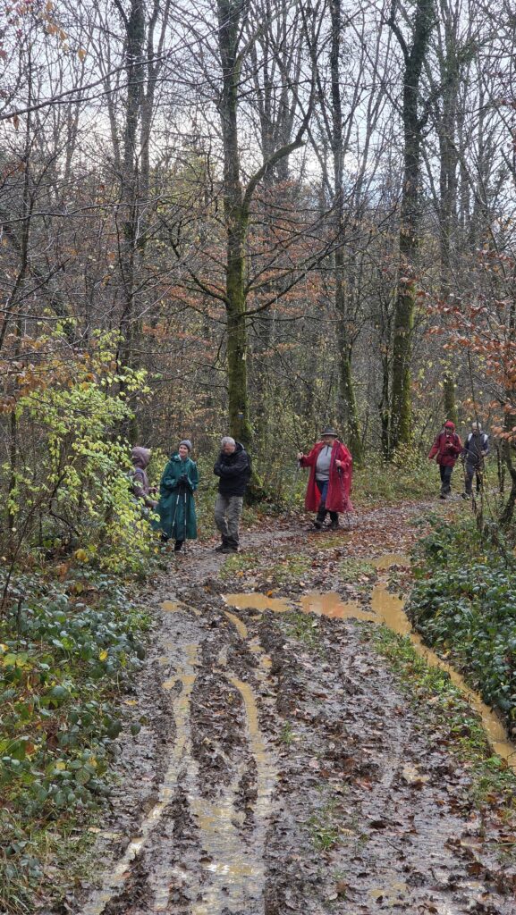 Les estomacs gargouillent…il est temps de trouver un abri pour reprendre des forces et se sécher un peu. Nous coupons les virages de la route par des raccourcis glissants et boueux. Les bâtons étaient bien utiles.