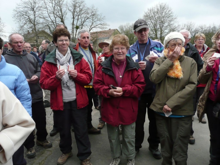 Les marcheurs du jour : Af-ccc (41 participants), Bol d’Air de Vy-les-Lure (22), Marche buissonnière d’Héricourt (21), association des Amis de St Jacques en Alsace (16), Découverte des 3 Vallées de Belfort (14), La Bermontagne de Bermont (13), club de marche d’Audincourt (11), Guy Berçot, président du comité régional de la FFR, des représentants de la Compagnie Belfort-Loisirs, de Codérando, du comité départemental de la randonnée pédestre de Haute-Saône, de l’association des pèlerins de Compostelle et Rome en Franche-Comté, de la Confraternité des pèlerins de Saint-Jacques en Bourgogne, des Sports généraux section marche de Héricourt, de la Vallée du Rupt, et de nombreux marcheurs individuels, en couple, en famille, entre amis…